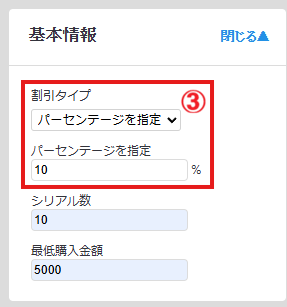 ③で金額を固定した割引タイプを選んだ場合は、ここに各シリアルで割引する金額(基準通貨)を半角数字で入力してください。