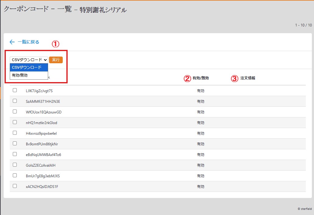 - CSVダウンロード:割引コードの値をCSV形式で取得できます。シリアル数が多い時に一括で値を取得したい場合や、配布済みかどうかの管理に使うこともあります。